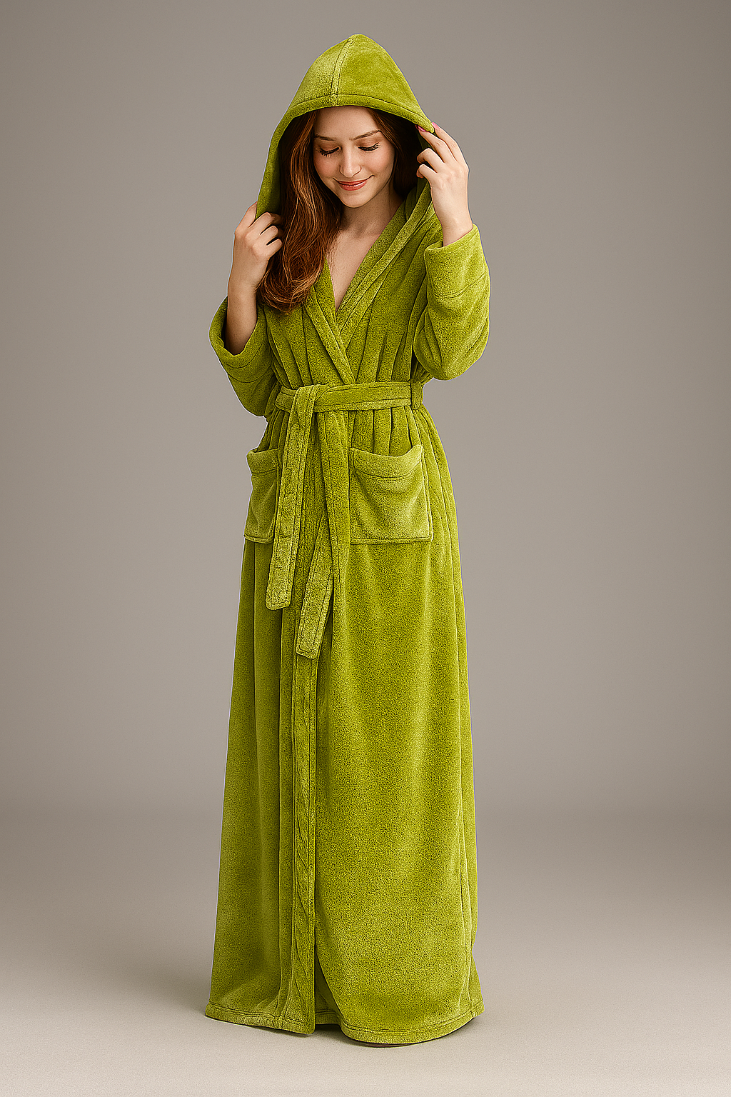 Nos peignoirs sont conçus pour offrir une expérience de confort supérieure. Nous utilisons des matières premières soigneusement sélectionnées, souvent un mélange de microfibre de haute densité pour garantir une douceur exceptionnelle (le côté "velouté") et une meilleure capacité d'absorption. Le design est également pensé pour une coupe élégante qui reste agréable à porter, contrairement aux modèles classiques souvent trop lourds ou mal coupés.