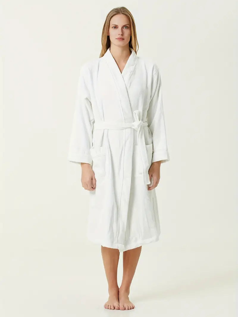 Nos peignoirs sont conçus pour offrir une expérience de confort supérieure. Nous utilisons des matières premières soigneusement sélectionnées, souvent un mélange de microfibre de haute densité pour garantir une douceur exceptionnelle (le côté "velouté") et une meilleure capacité d'absorption. Le design est également pensé pour une coupe élégante qui reste agréable à porter, contrairement aux modèles classiques souvent trop lourds ou mal coupés.